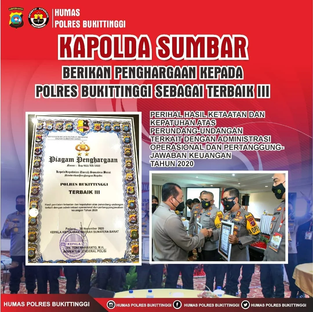 Dalam Gelar Operasional tersebut, Kapolda Sumbar memberikan piagam penghargaan Ketaatan dan Kepatuhan Atas Perundang-undangan Terkait Administrasi Operasional dan Pertanggung jawaban Keuangan selama tahun 2020, dan sesuai dengan hasil penilaian dari tim Polda Sumbar, maka Polres Bukittinggi mendapatkan penilaian terbaik III.