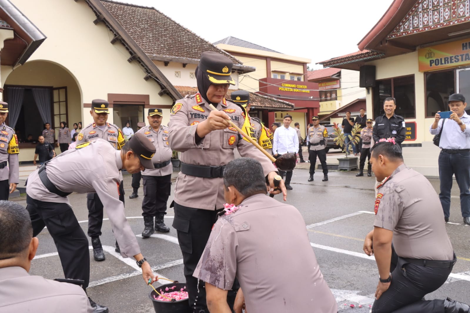 Kapolresta Bukittinggi Kombes Pol. Yessi Kurniati, S.I.K., M.M. menyiramkan air kembang kepada personil yang mendapat kenaikan pangkat |